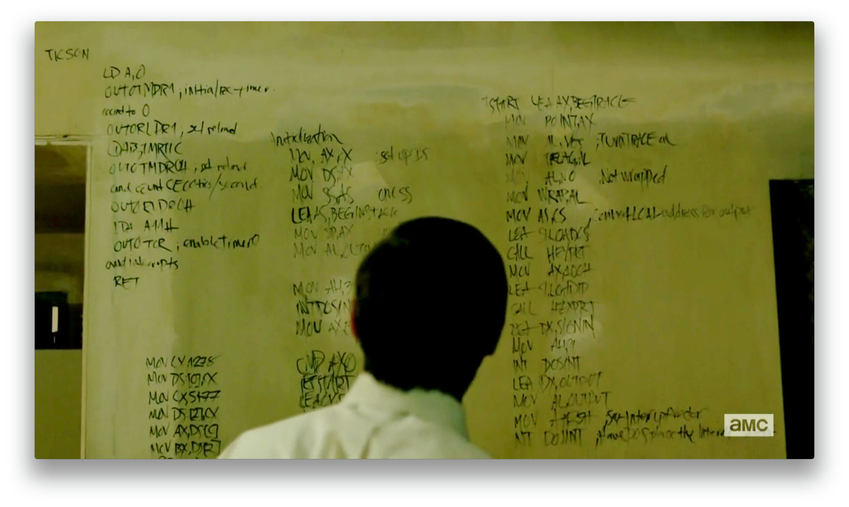 So if you deconstruct the code on this whiteboard, you quickly notice that while it IS assembly language, it is NOT the sort of assembly language you would find in a ROM BIOS, let alone ANYTHING that would leave you in awe.